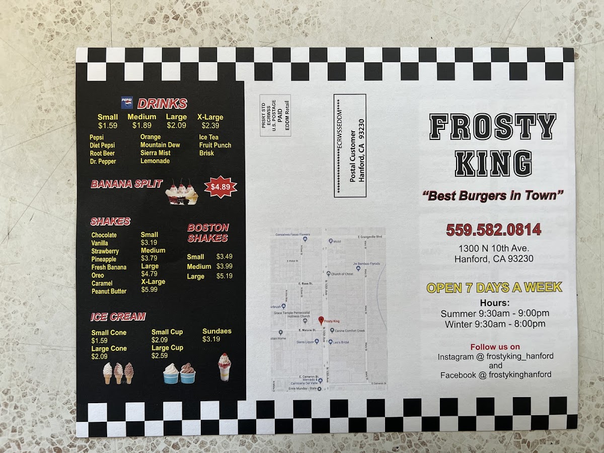 When you step into Frosty King, you're in for a treat! This local favorite in Hanford offers a delightful mix of comfort food and refreshing sweet options, making it a great spot for a quick bite or a relaxing meal. The Frosty King Menu features a variety of mouthwatering choices, from juicy burgers and crispy fries to ice creams and shakes that hit the spot on a sunny day. Whether you're in the mood for something savory or a sweet indulgence, there's something here to satisfy every craving. The laid-back atmosphere is perfect for enjoying a casual meal with friends or family. Don’t miss out on the classic flavors that have made this place a beloved part of the Hanford community.